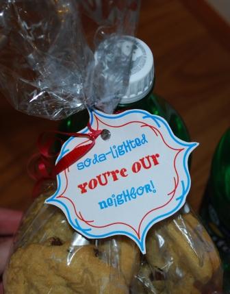 I thought that it would be a great gift for the new neighbors. I wonder why I didn't think of that before! I have used the same saying for teachers. I pulled up the site ~after I bought the soda and made the cookies ~ to find out that it costs $5 for the tags. Well, I'm cheap enough that I made my own. They are nearly as pretty as hers, but they are free. I also changed up the colors so they didn't look like they were intended for Christmas: